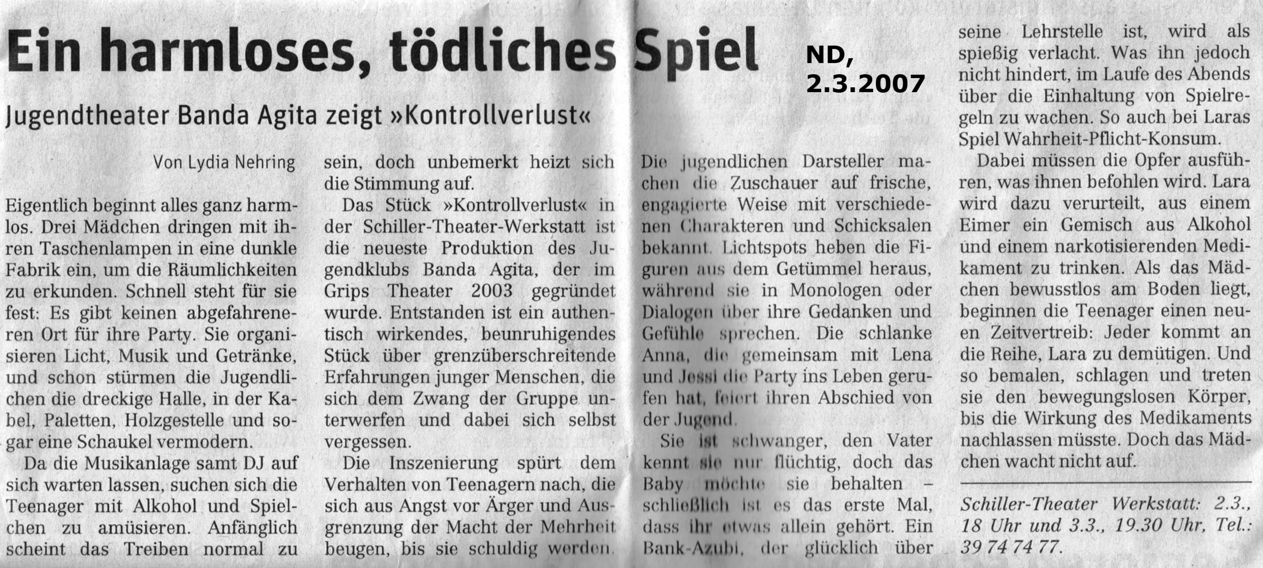 Pressemitteilung: Filmtheaterprojekt "Kontrollverlust" des GRIPS Theaters, Jugendspielclub Banda Agita mit dem Sonderpreis des Medienpreis MediaMax 2007 ausgezeichnet! mehr (pdf)